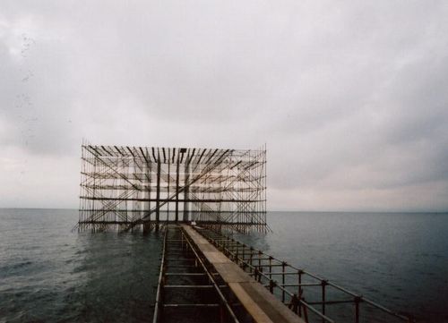 発射ステージ下部単管組立て状況(中央部) 発射ステージ下部単管組立て状況(端部) 発射ステージ下部完了 発射ステージ下部完了全景 資材運搬状況