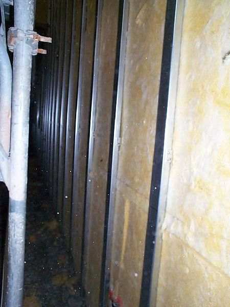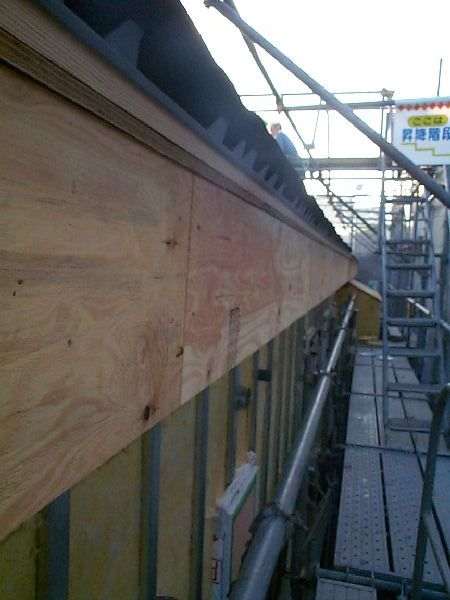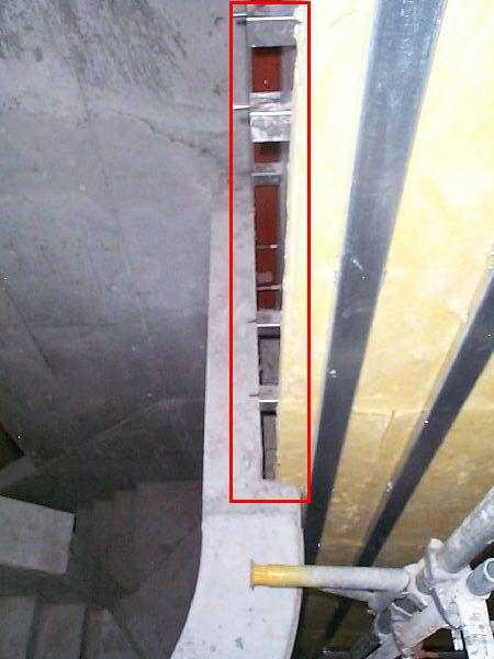 外壁と屋根の取合部分です。 ケラバ部分は、金属板仕上げのためこのような納まりになっています。 下部に見える縦のレールのような物が、外壁を支持する下地材料で、ブラケット材料と接合されています。 外階段の手すり部分と外壁の取合です。 通常、赤枠で囲まれた部分は、外壁とコンクリートで一体化するのですが、このような部分が熱橋に成りますので、外断熱工法では縁を切り断熱材を設置します。 コンクリート外壁に設置されたブラケットに外壁支持材を取付け、断熱材を充填したところです。