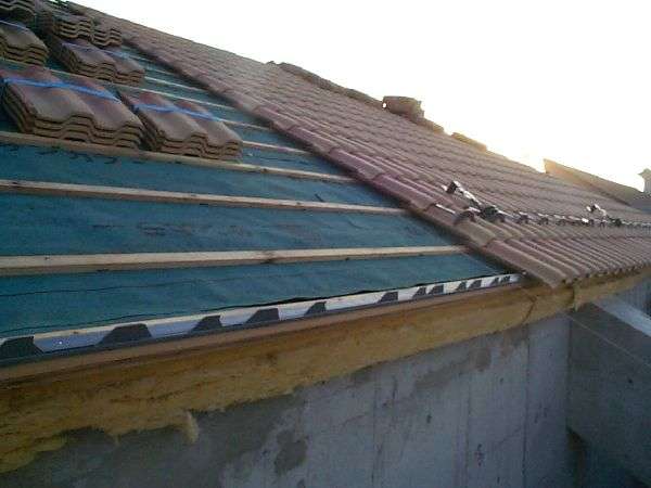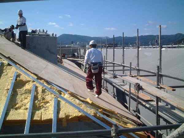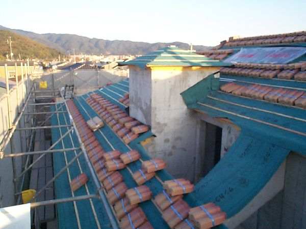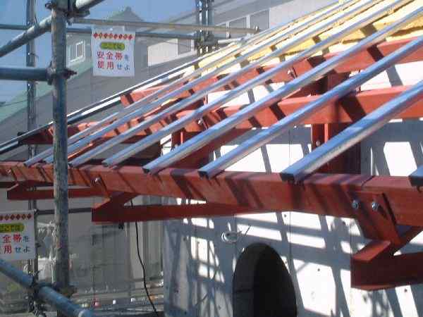 庇部分の屋根下地は、このように鉄骨部分にまで延長しておきます。 屋根下地材設置後、瓦下地のコンパネを設置します。 コンパネの上の施工は、通常工法と差はありません。 防水シートの上から瓦桟を設置し、瓦を葺いて行きます。 軒先を見ると、各層がどの様になっているかがよく分かります。